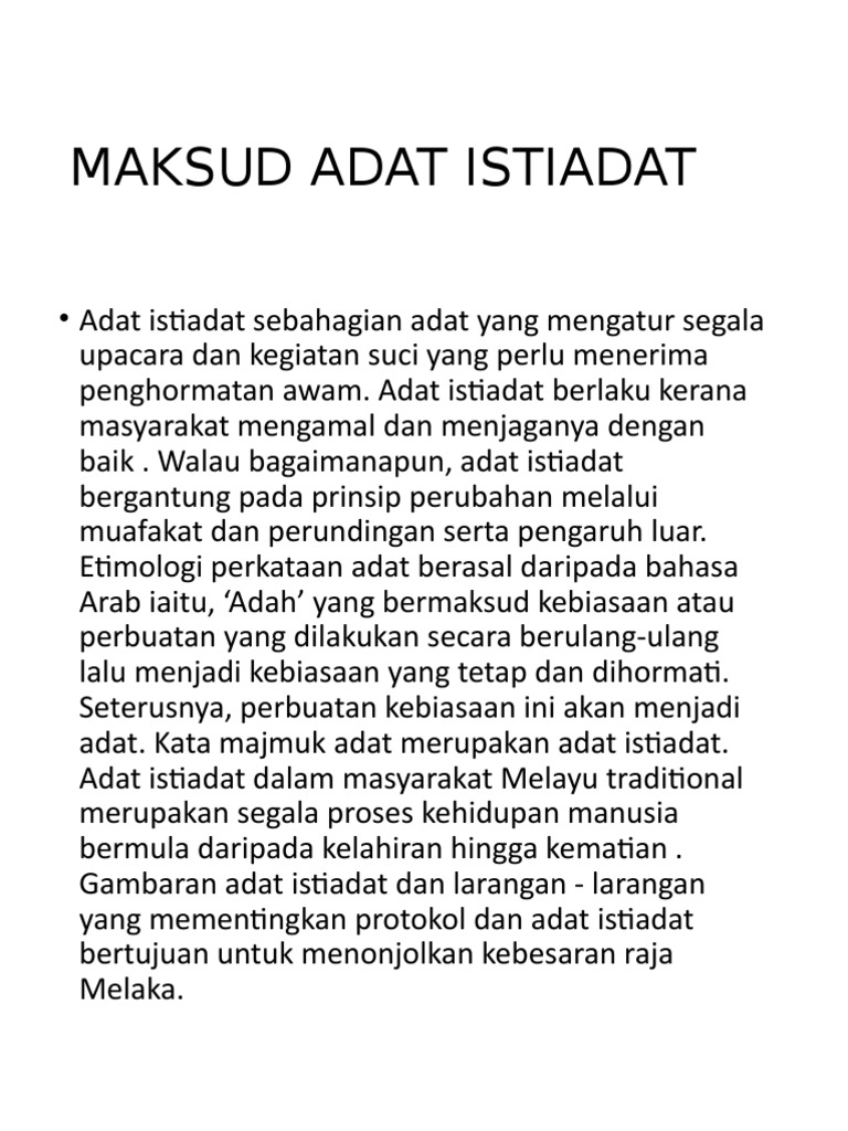 Namun apa juga penafsiran dan perbezaan adat dalam sesebuah masyarakat itu TUJUANNYA ADALAH SERUPA IAITU UNTUK MEMBENTUK SUATU MASYARAKAT YANG MAJU DINAMIK DAN PROGRESIF. Adat Melayu merupakan konsep yang menjelaskan satu keseluruhan cara hidup Melayu di alam Melayu. 2 Untuk memahami apa sebenarnya rahmat Tuhan kepada manusia dari sudut sejarah seseorang itu.