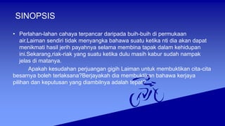 Laiman lebih suka bekerja sendiri dengan mengusahakan ladang tembikai. Sinopsis perlahan lahan cahaya terpancar daripada buih-buih di permukaan airlaiman sendiri tidak menyang ka bahawa suatu ketika nanti dia akan dapat menikmati hasil jerih payahnya selama membina tapak dalam kehidupan inisekarangriak-riak yang suatu ketika dulu masih kabur sudah nampak jelas di matanyaapakah kesudahan perjuangan gigih laiman. Semasa menjalani latihan dia menjalankan tugasnya dengan bersungguh-sungguh.