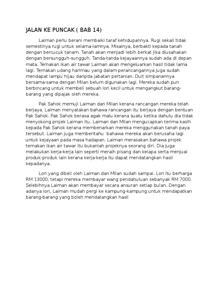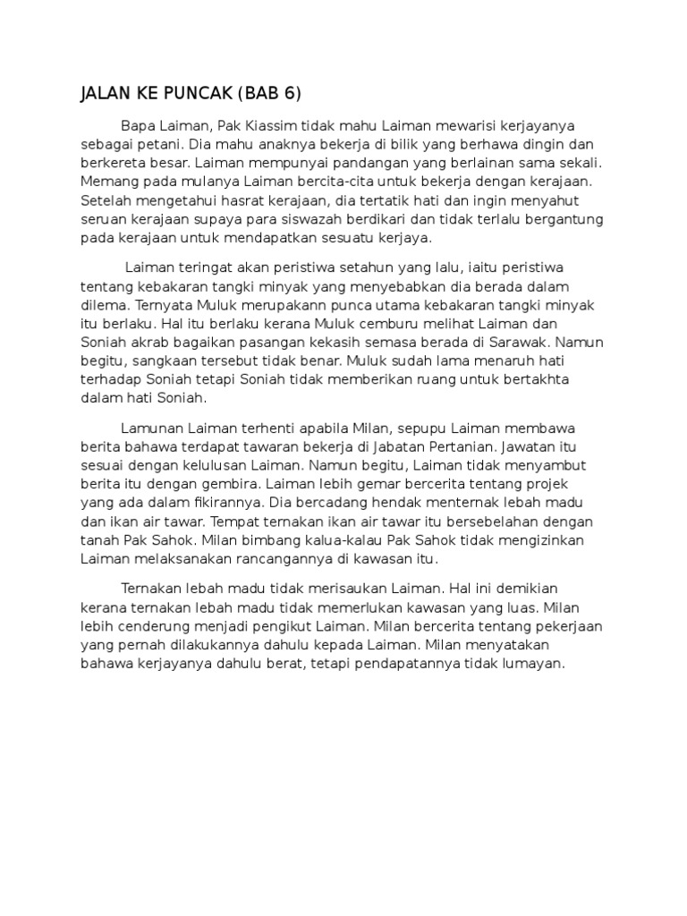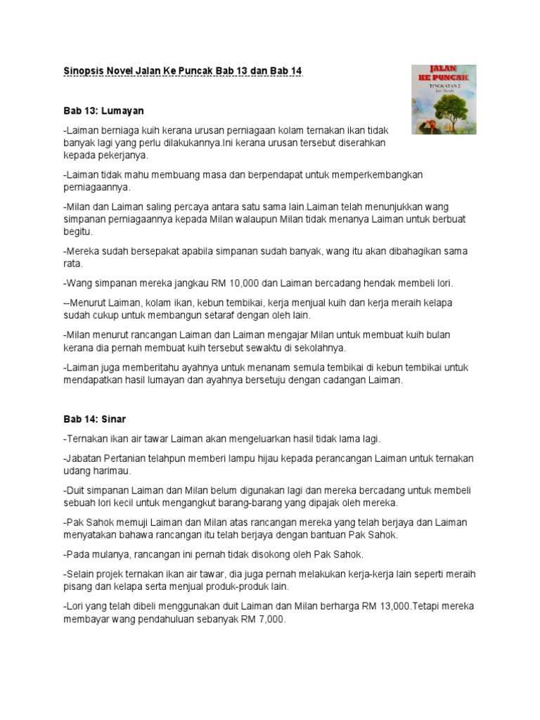 Novel BM Bahasa Melayu Tingkatan 3 PT3 Pentaksiran Tingkatan 3. Novel ini bermula tahun 2016 sehingga 2019 Sinopsis Penuh Novel Jalan Ke Puncak Novel Jalan ke Puncak mengisahkan tentang seorang pemuda bernama Laiman yang berkelulusan ijazah sarjana muda kejuruteraan tetapi enggan bekerja makan gaji. Ketabahan menghadapi dugaan hidup pemuda dalam membina kecemerlangan Contohnya Laiman tabah menghadapi segala rintangan terutama daripada kerjaya masa depannya dengan cara keluarganya yang tidak bersetuju dengan keputusan untuk bekerja sendiri.